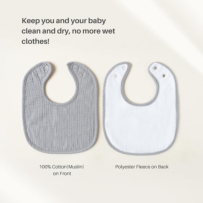 • SOFT and ABSORBENT: The front of baby bibs are made of 100% cotton(Muslin) and the back are polyester(comfort fleece) for maximum absorption with skin-friendly soft touch. The bib soaks up all drools and spits to keep you and your baby clean and dry, no more wet clothes!