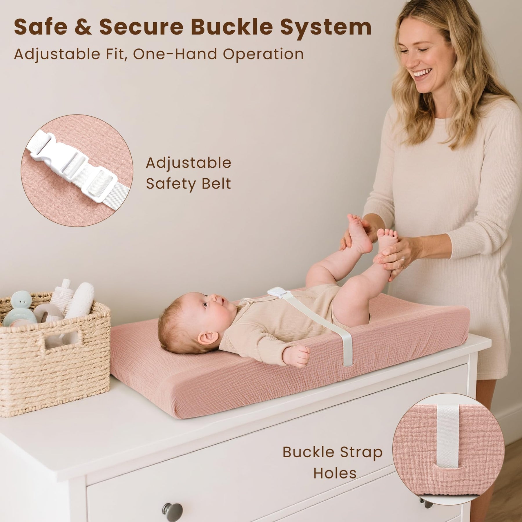 - Enhanced Safety for Peace of Mind: Featuring contoured anti-roll sides and a quick-release safety belt, this changing pad keeps your baby secure. The non-slip bottom and adjustable straps add stability, ensuring a smooth and safe diaper change every time